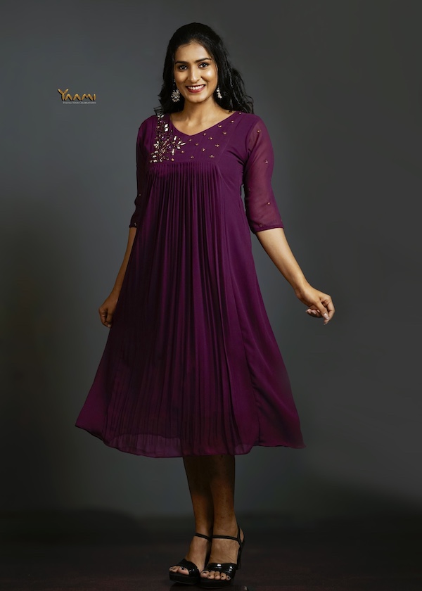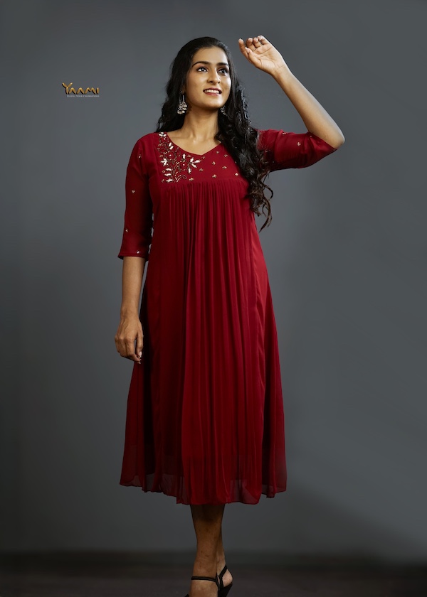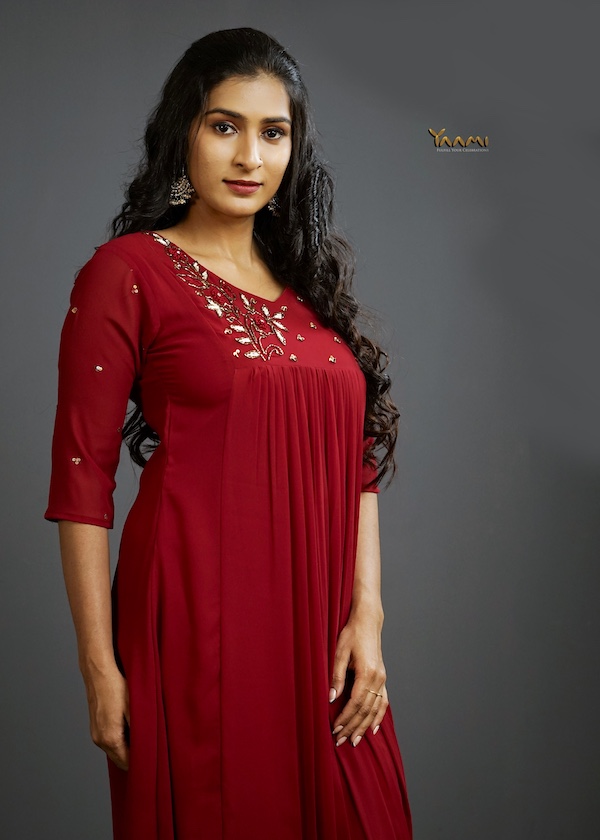 - A stunning gathered kurta crafted in Georget material featuring delicate thread and sequin handwork motifs scattered across the sleeves.