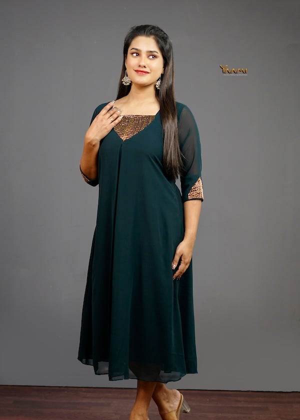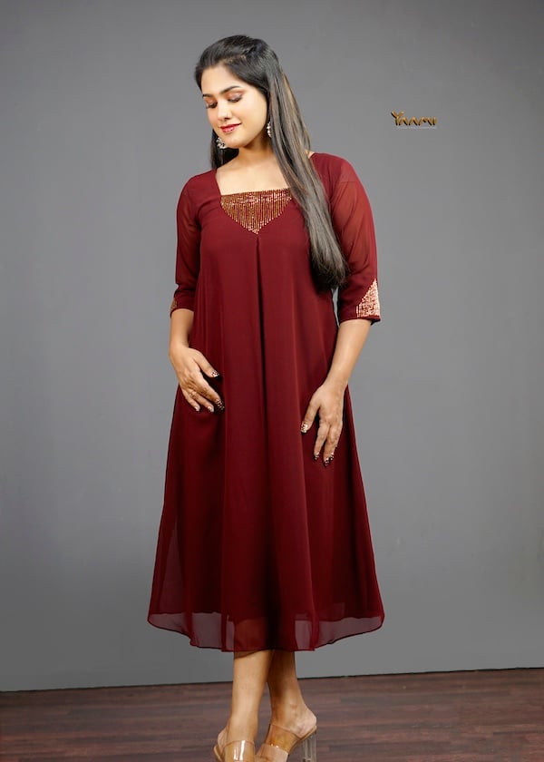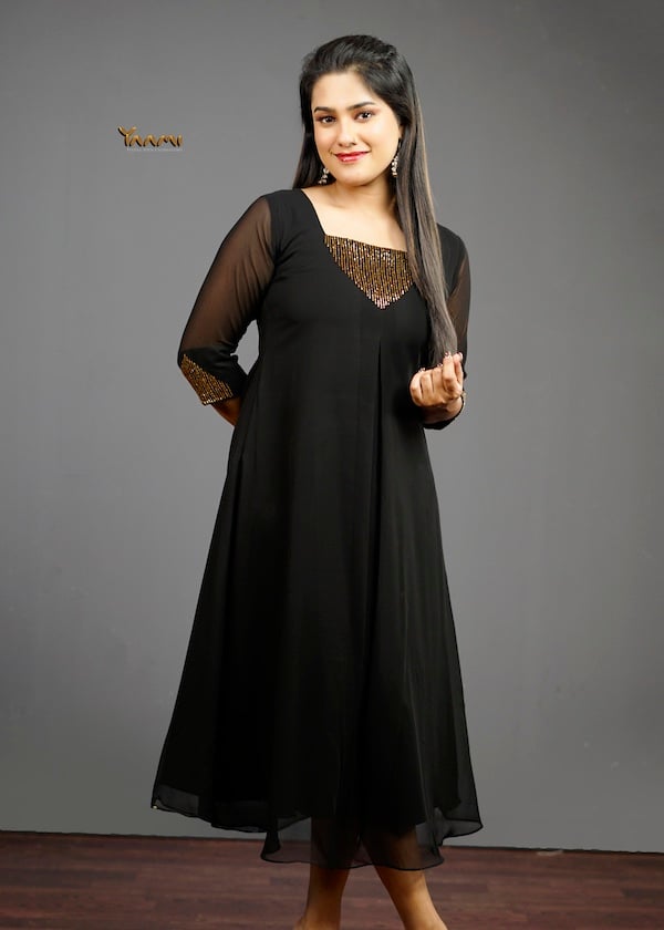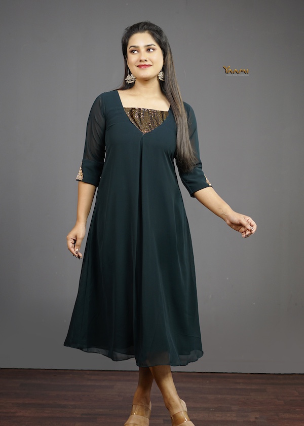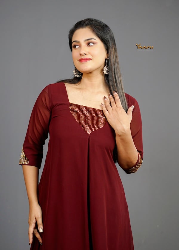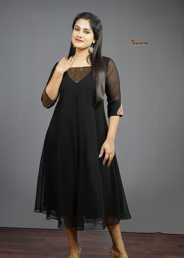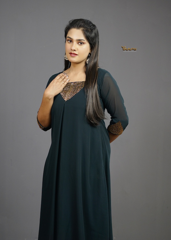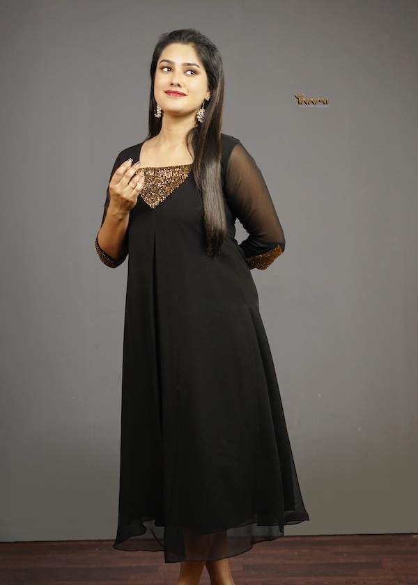 - Sleeves: It has three-quarter length sheer sleeves with antique cut beads work