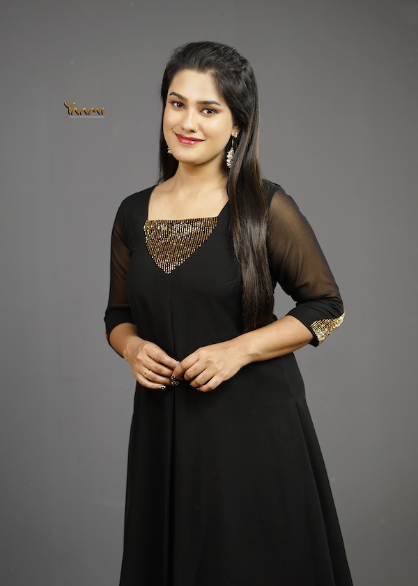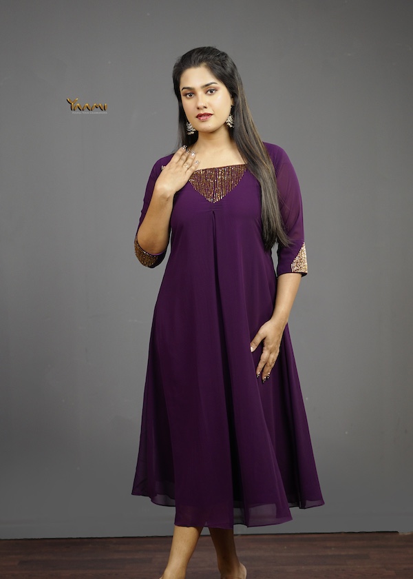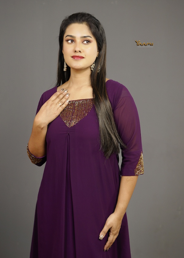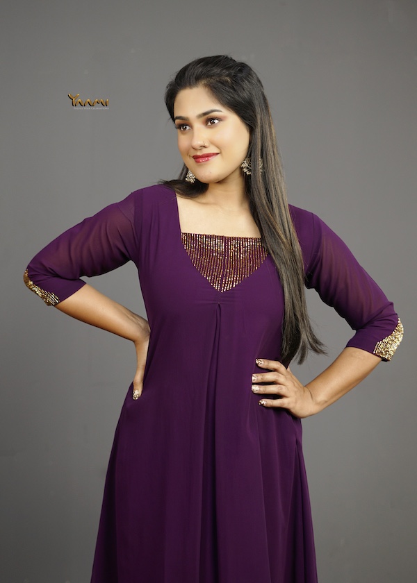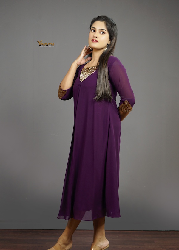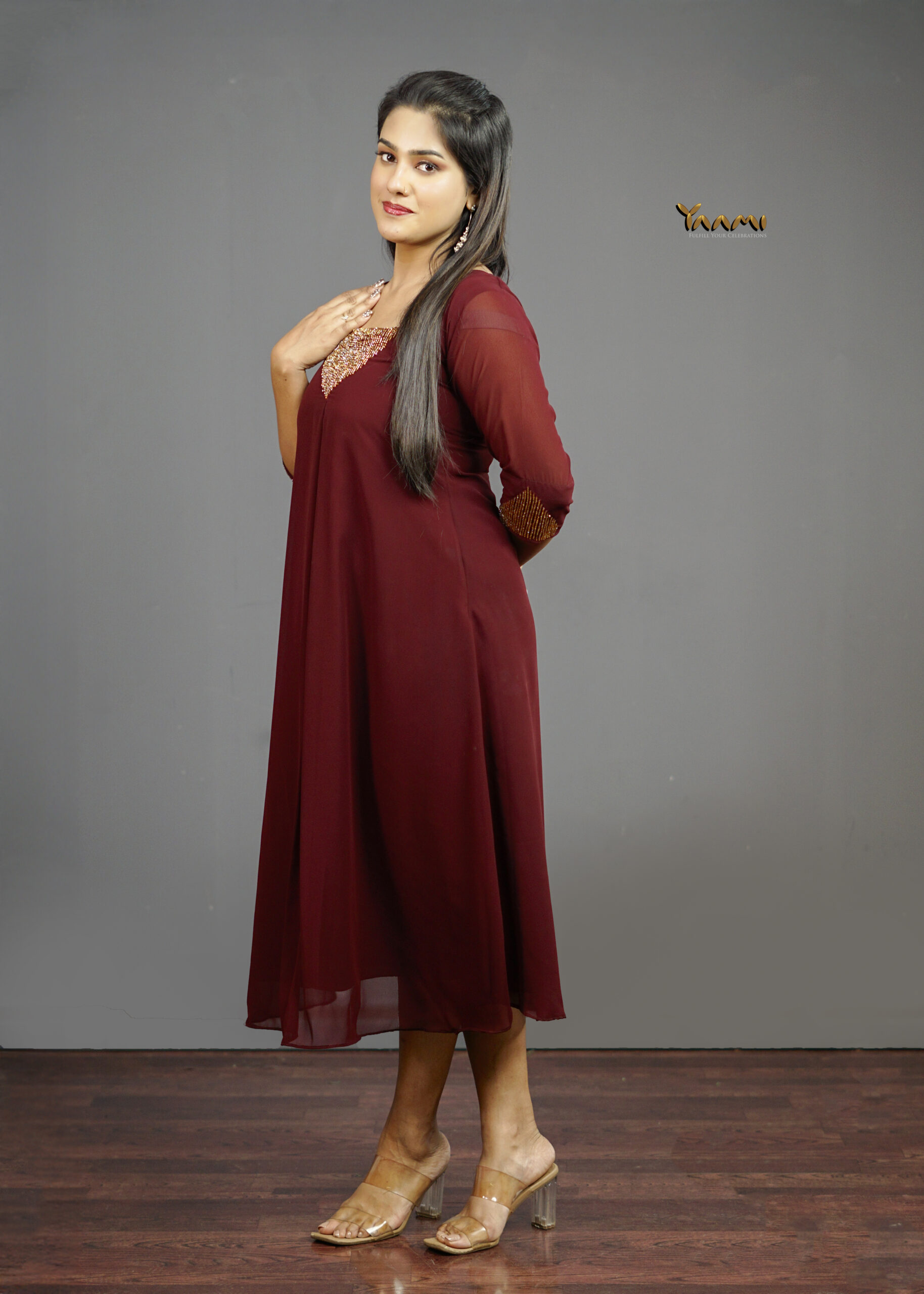 - Sleeves: It has three-quarter length sheer sleeves with antique cut beads work