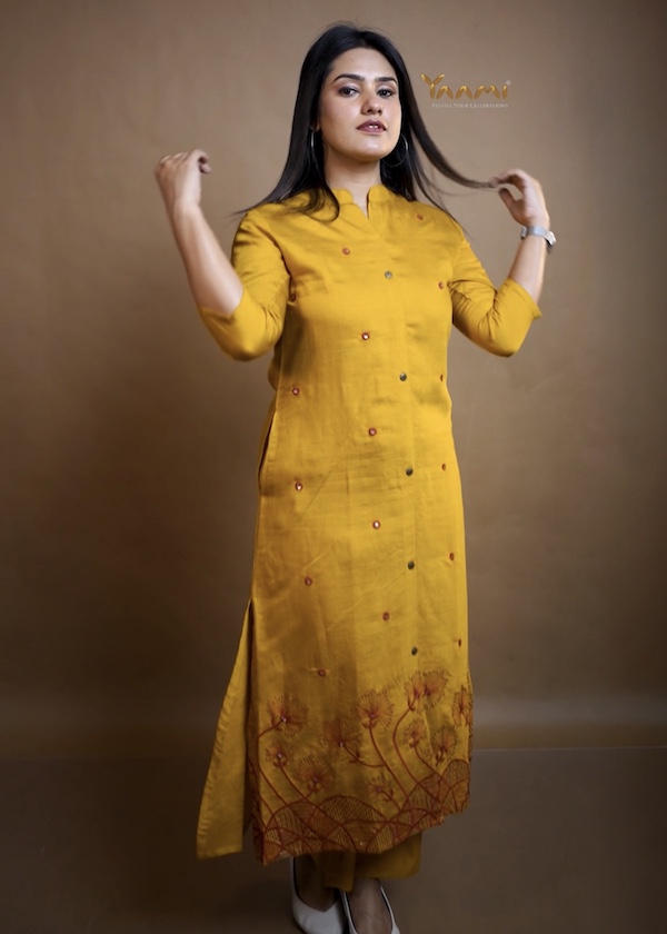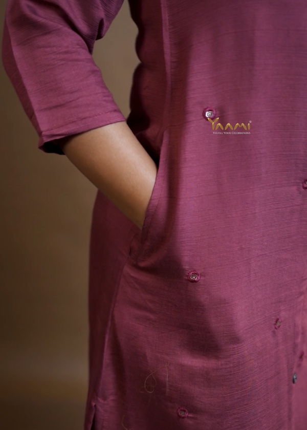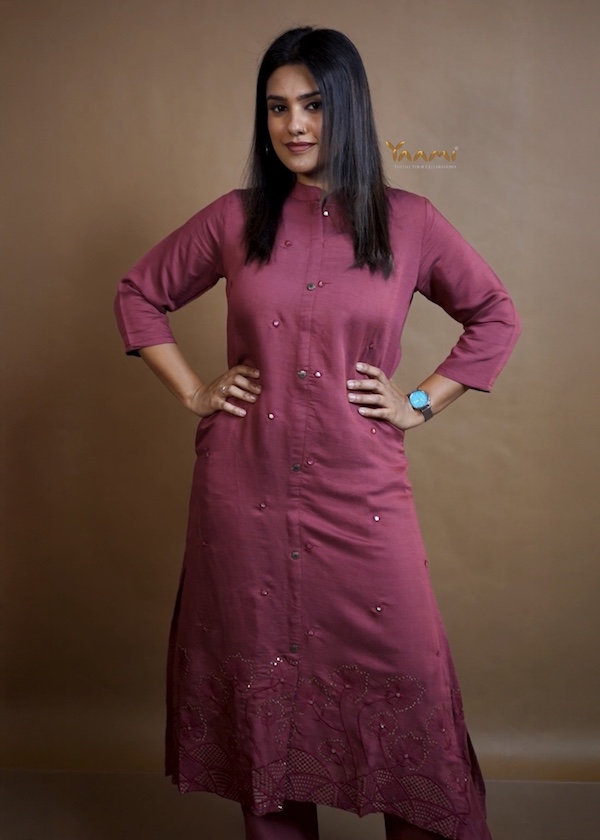The top is detailed with subtle machine thread embroidery that adds a touch of charm, paired with easy, well-fitted bottoms that move with you. Designed with functional side pockets, the top blends style with everyday ease.