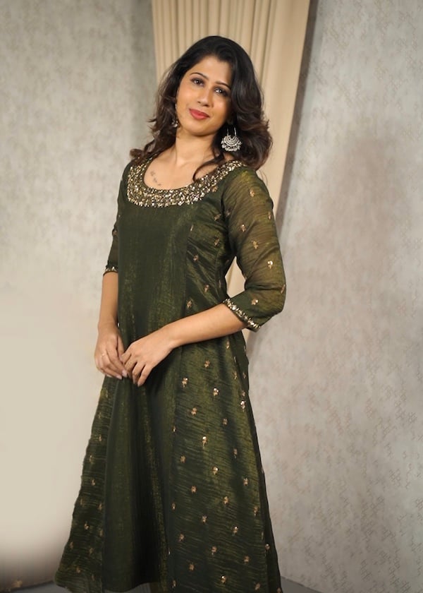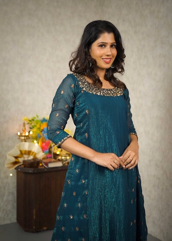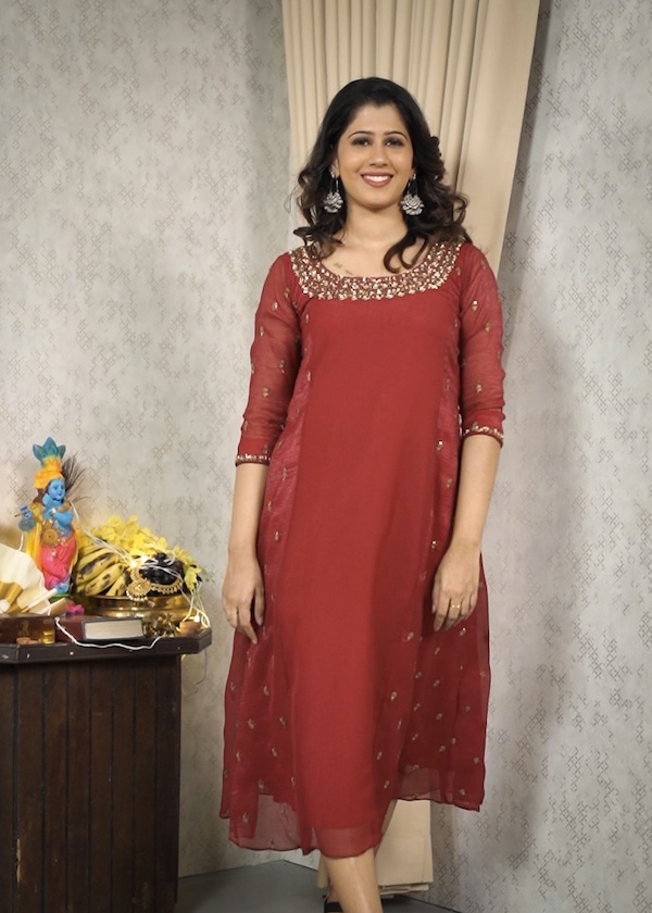 The kurta is thoughtfully tailored to enhance your natural shape — the centre panel is kept plain, while the side panels feature delicate small buttas, creating a visually slimming effect that flatters every body type. The sheer sleeves and graceful flare add sophistication and ease of movement.