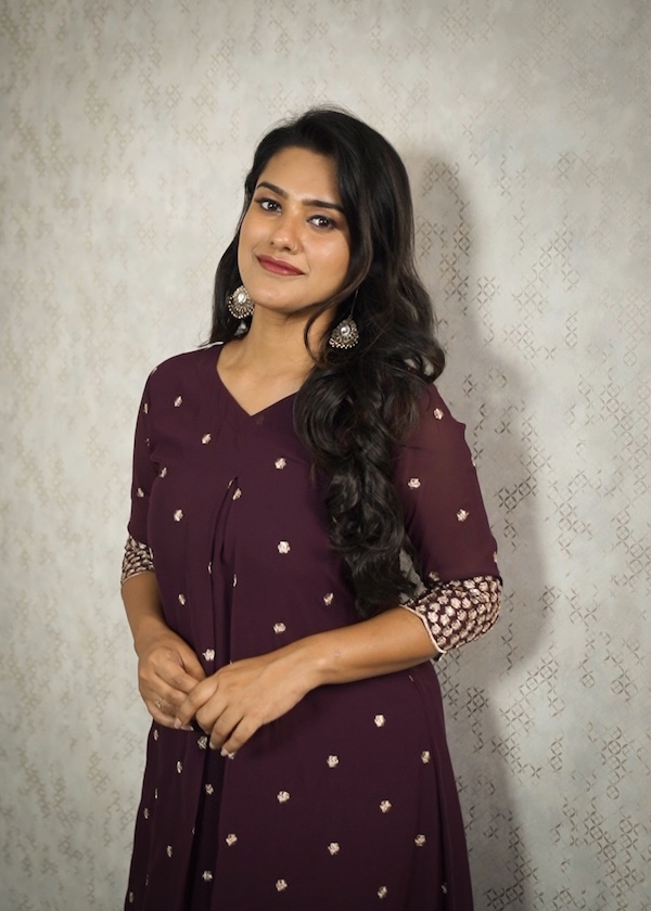 It features a flattering curved V neckline and 3/4th sleeves with beautifully detailed embroidery, adding richness and charm to the design. A neat centre pleat in the front adds structure and gives a graceful fall to the outfit.