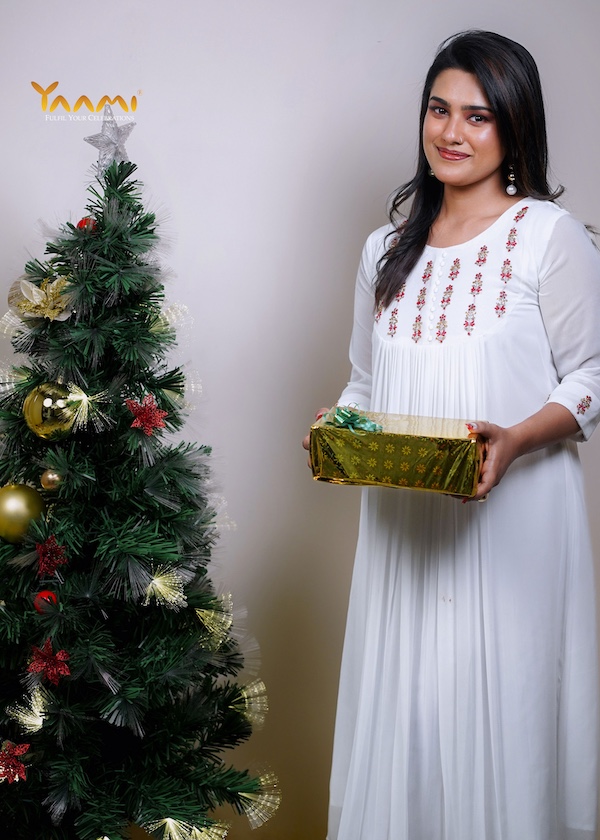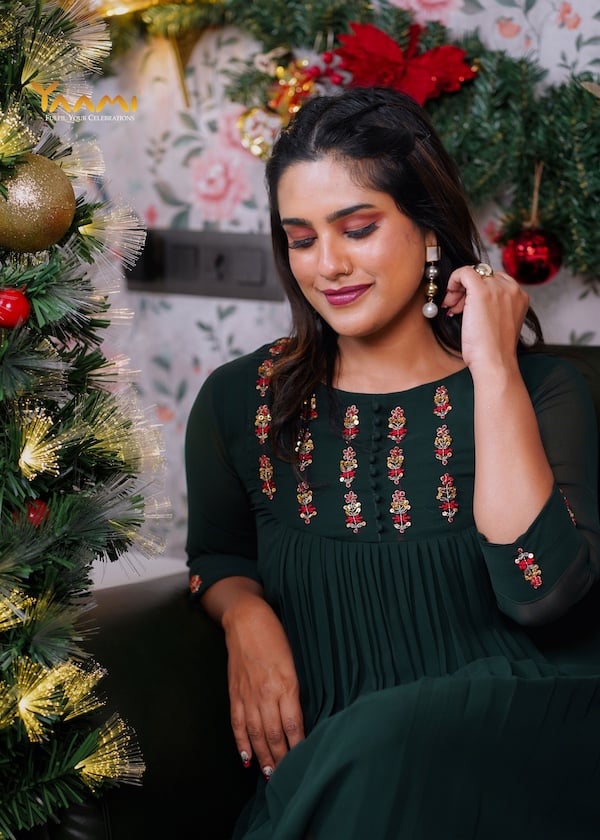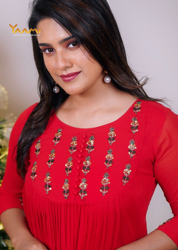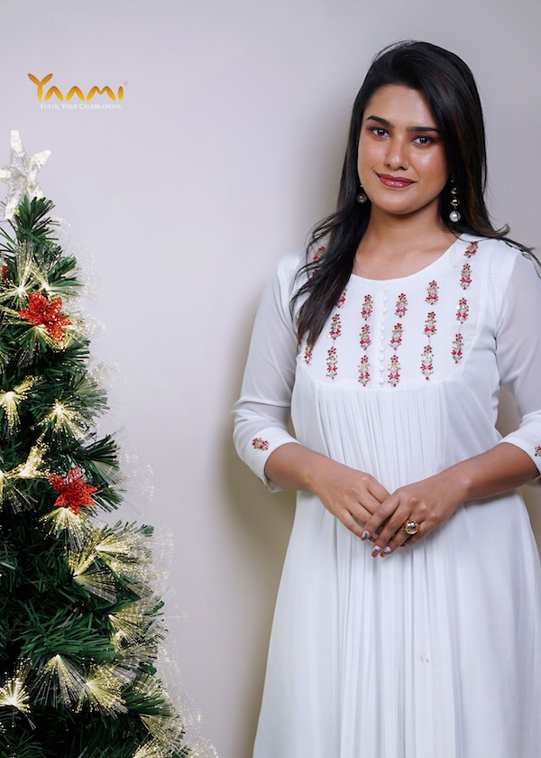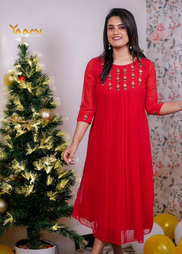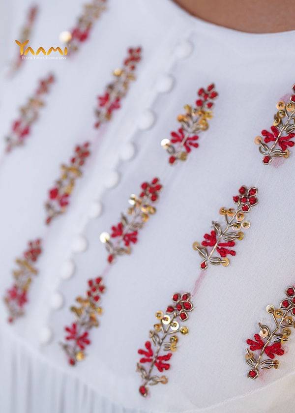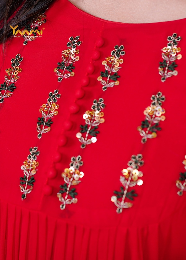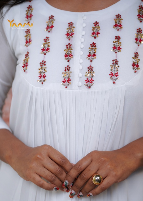 The most distinctive feature is the fine, vertical pleating that starts just below the embroidered yoke and continues down the length of the garment, adding texture and movement.