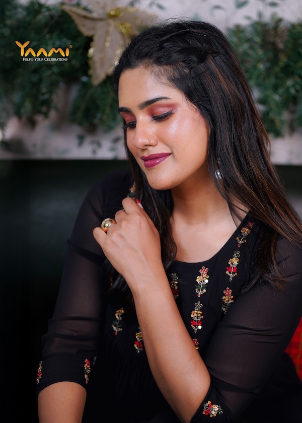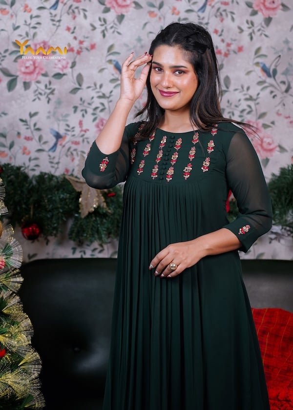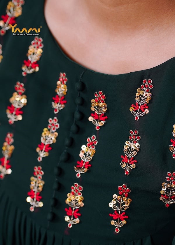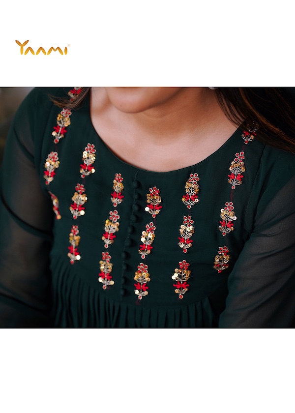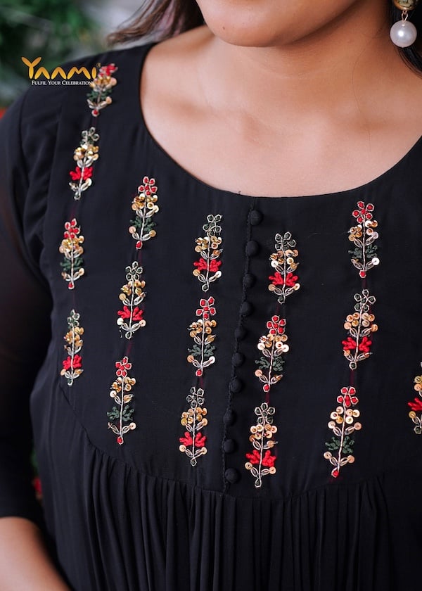 - Featured here is a beautiful gathered kurta.It appears to be delicate Aari work or fine thread embroidery with potle buttons.