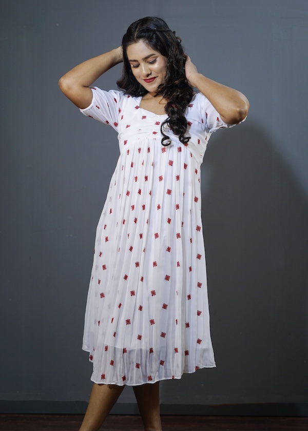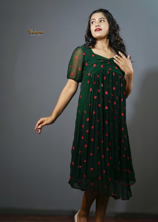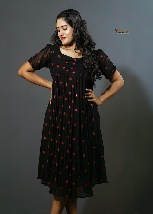 Indo western fusion frock,T his design Given the rich embroidery and vibrant color palette. It features gentle sweetheart neckline with subtle ruching or gathering across bust line. The length falls approximately around the knee, classifying i it as a mini or midi-length dress. The style is feminine, playful, and contemporary, perfect for a casual outing, a party, or a festive occasion.