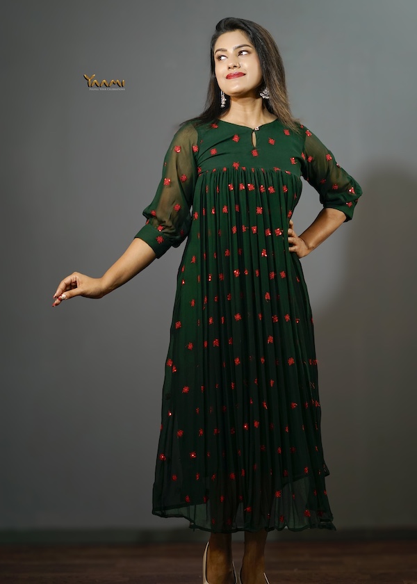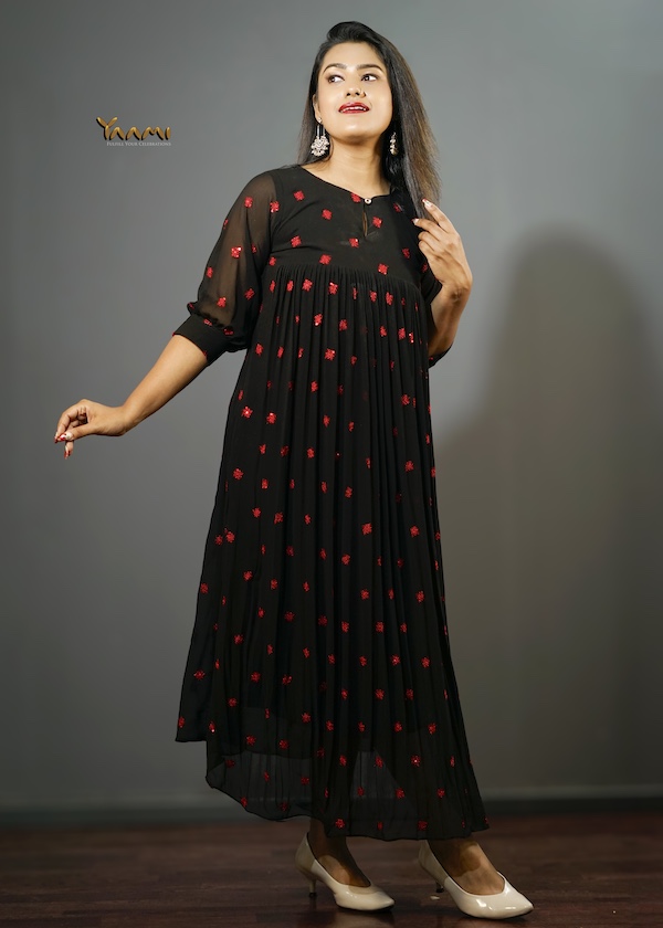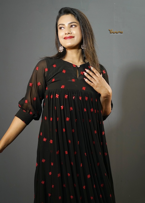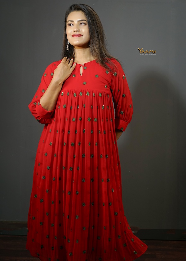 Crafted from a flowing, lightweight fabric, he dress features delicate, scattered red geometric motifs that add a vibrant pop of color tO the pristine base. The flattering empire waistline gives way to a gently gathered skirt that moves beautifully with every step. The design is elevated by sophisticated details, including three-quarter puff sleeves with fitted cuffs and a chic round neckline finished with a subtle keyhole opening.
